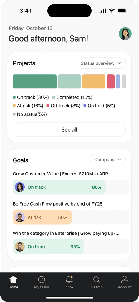 We set out to reimagine Asana’s mobile Home as a more useful, focused entry point for work. Starting with a small team, we explored bold ideas grounded in user research, then shipped a simplified first release that improved key metrics. This work laid the foundation for a more modern, mobile-native experience—one we could continue building on.
