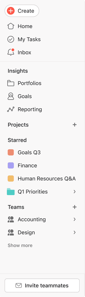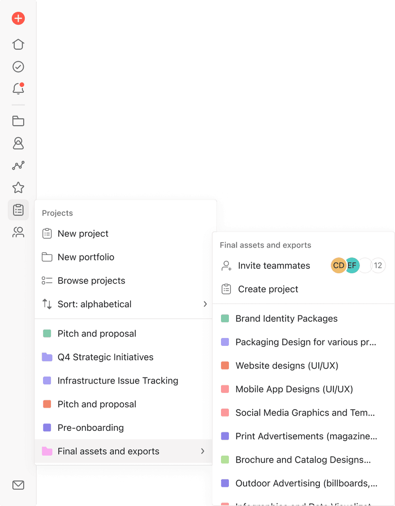 We redesigned Asana’s sidebar to improve navigation on smaller screens and support enterprise needs. This included introducing a new collapsed “minibar,” refining the expanded view, and rethinking iconography and interactions. The result was a more focused, flexible sidebar experience that scaled across user types and screen sizes.