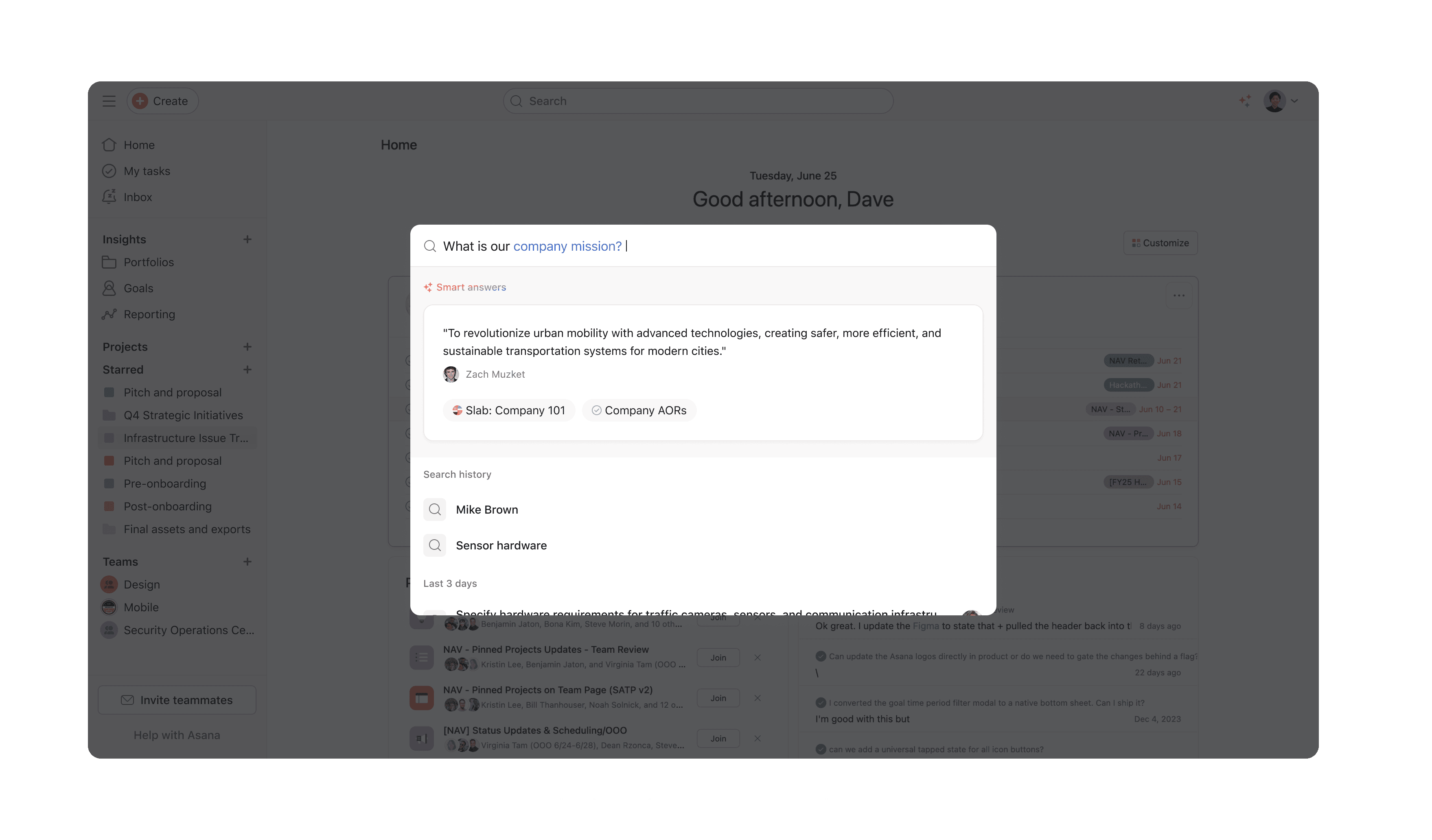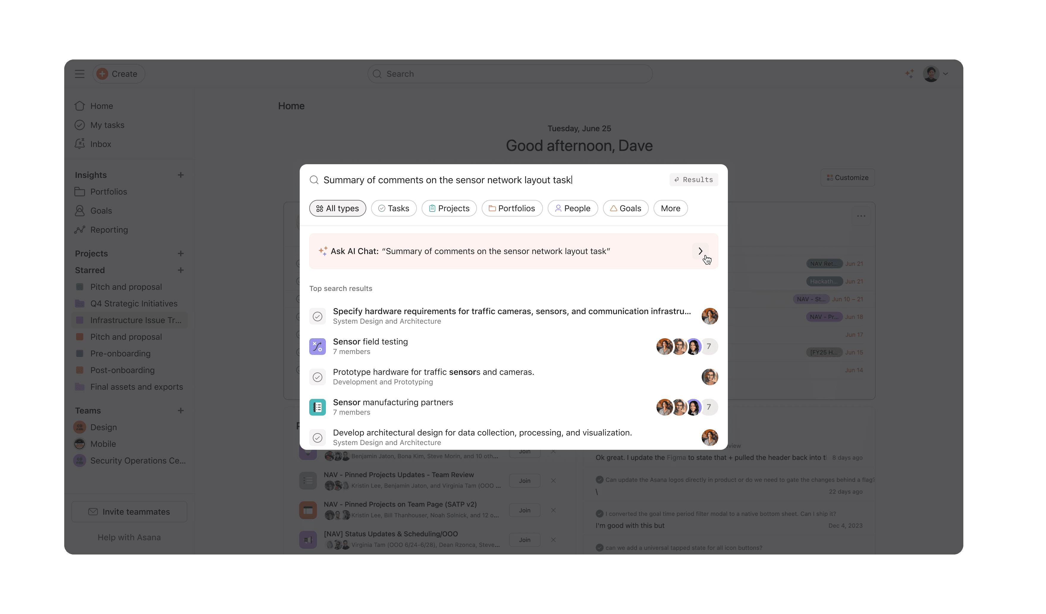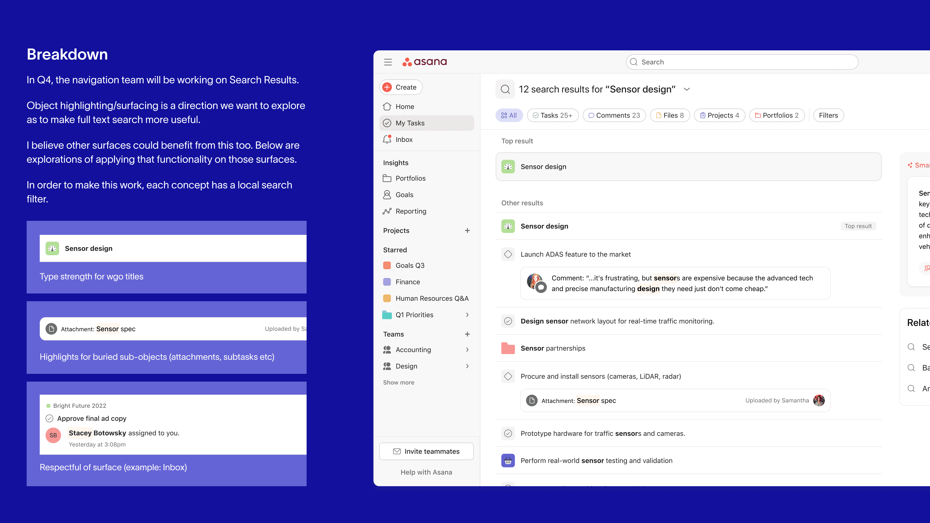Near the end of the half, I was asked to spend a few weeks exploring a new direction for both our basic search (modal) and full-page search results. Around the same time, Asana’s AI efforts were gaining momentum, and designers were encouraged to explore how AI could enhance the areas we owned.