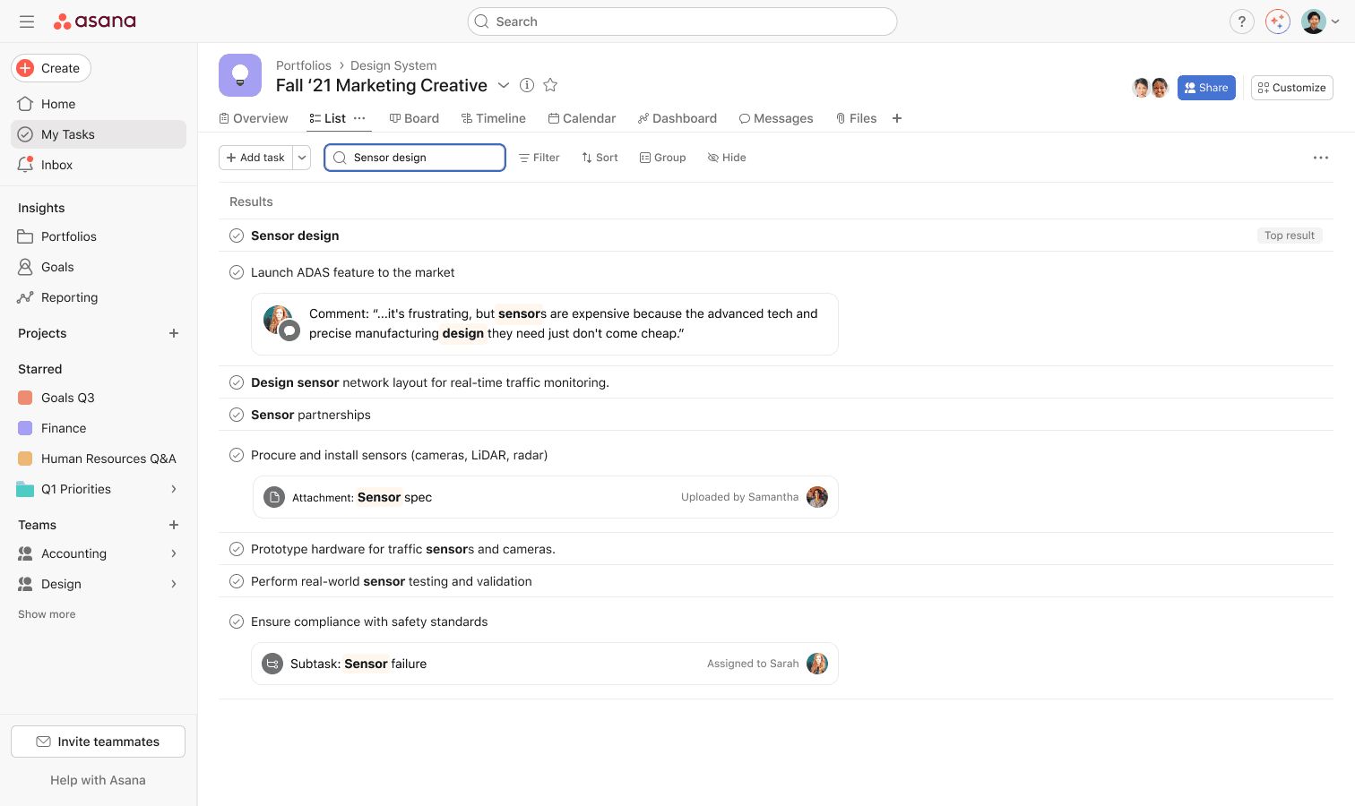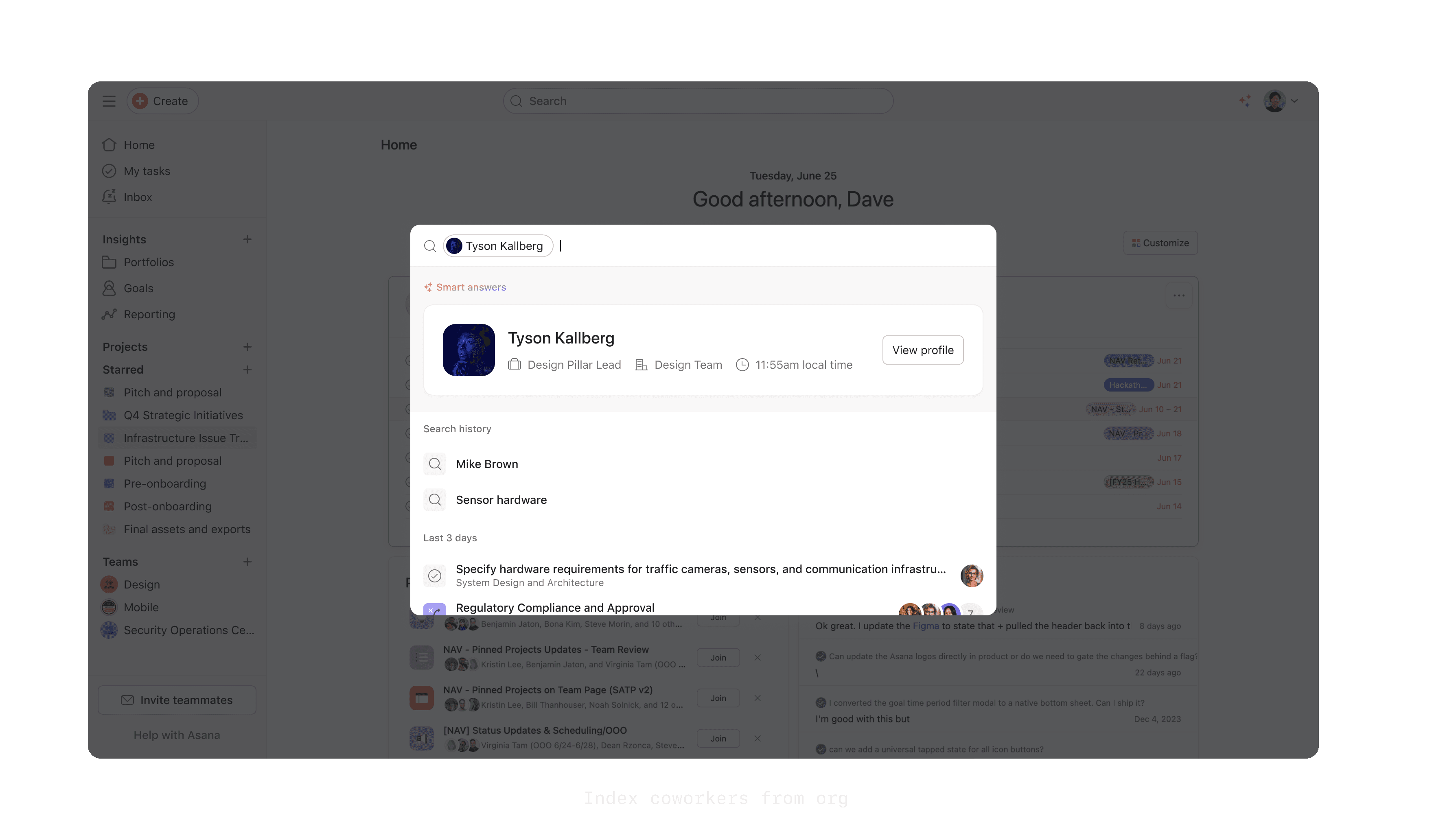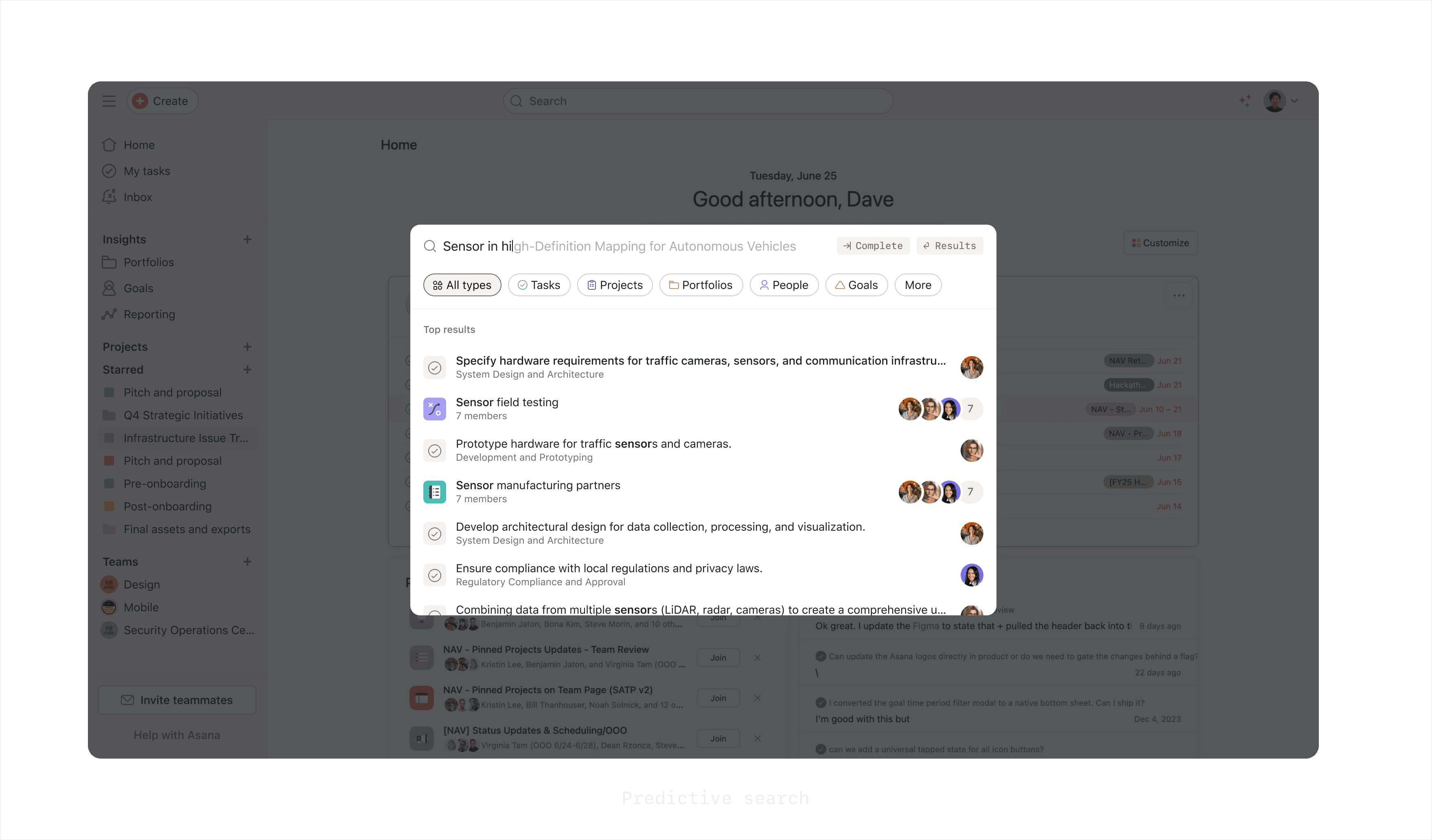 Near the end of the half, I was asked to spend a few weeks exploring a new direction for both our basic search (modal) and full-page search results. Around the same time, Asana’s AI efforts were gaining momentum, and designers were encouraged to explore how AI could enhance the areas we owned.