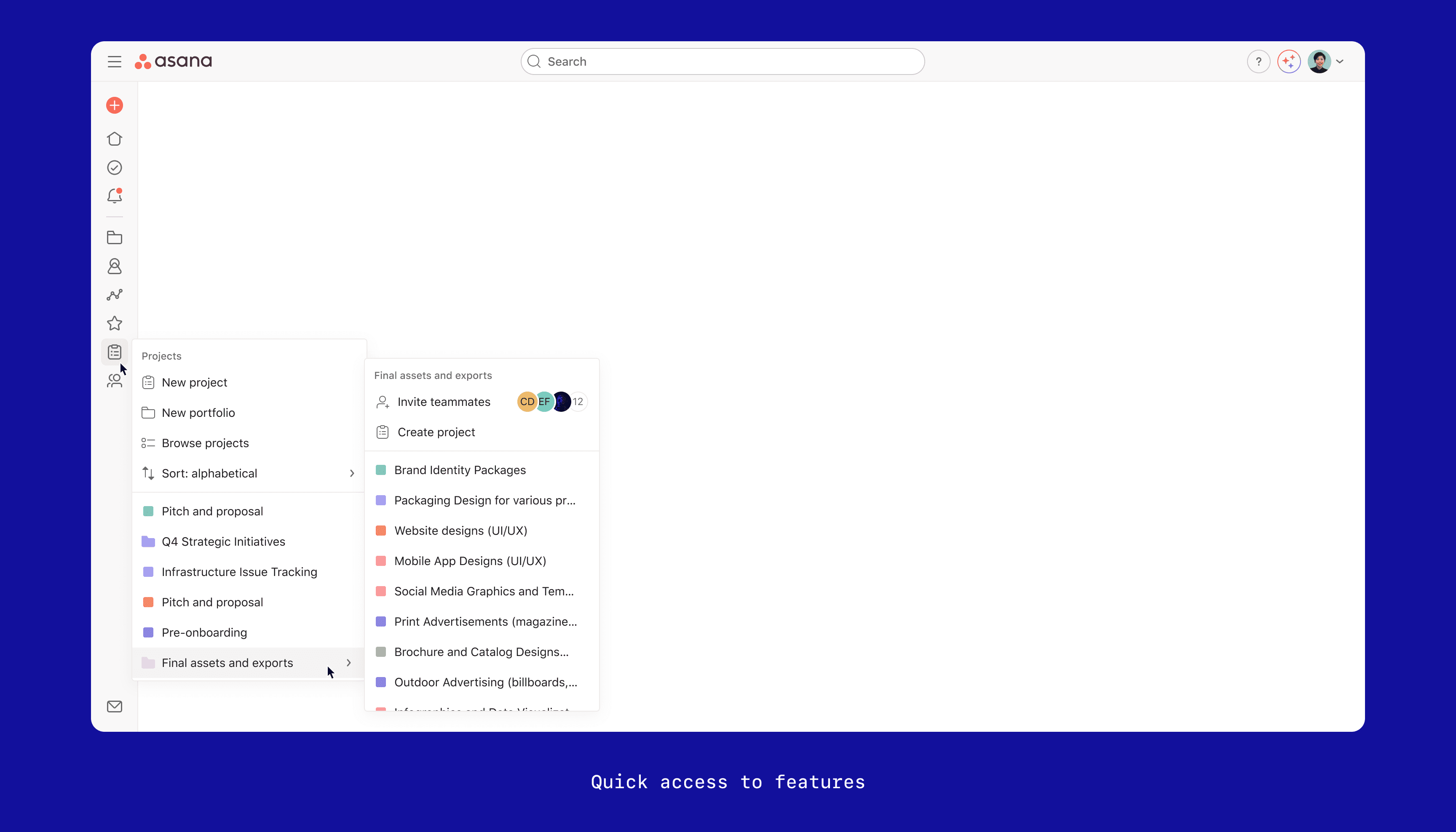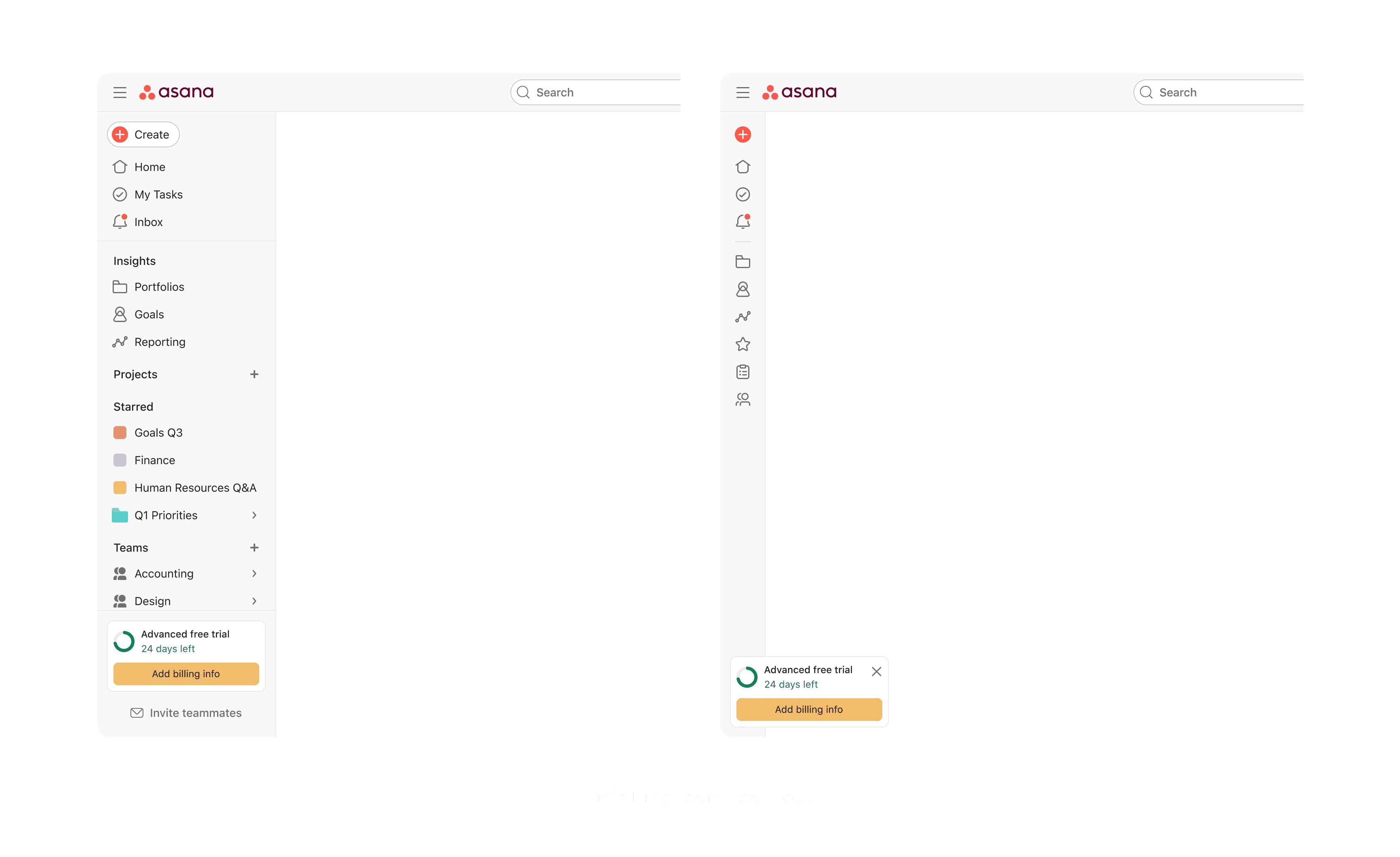 This project already had buy-in when I joined the team. We were addressing a clear navigation gap: Asana users don’t always have access to the sidebar—especially on small screens or when they manually collapse it. In fact, 17–20% of users load Asana on screens where the sidebar is auto-collapsed.